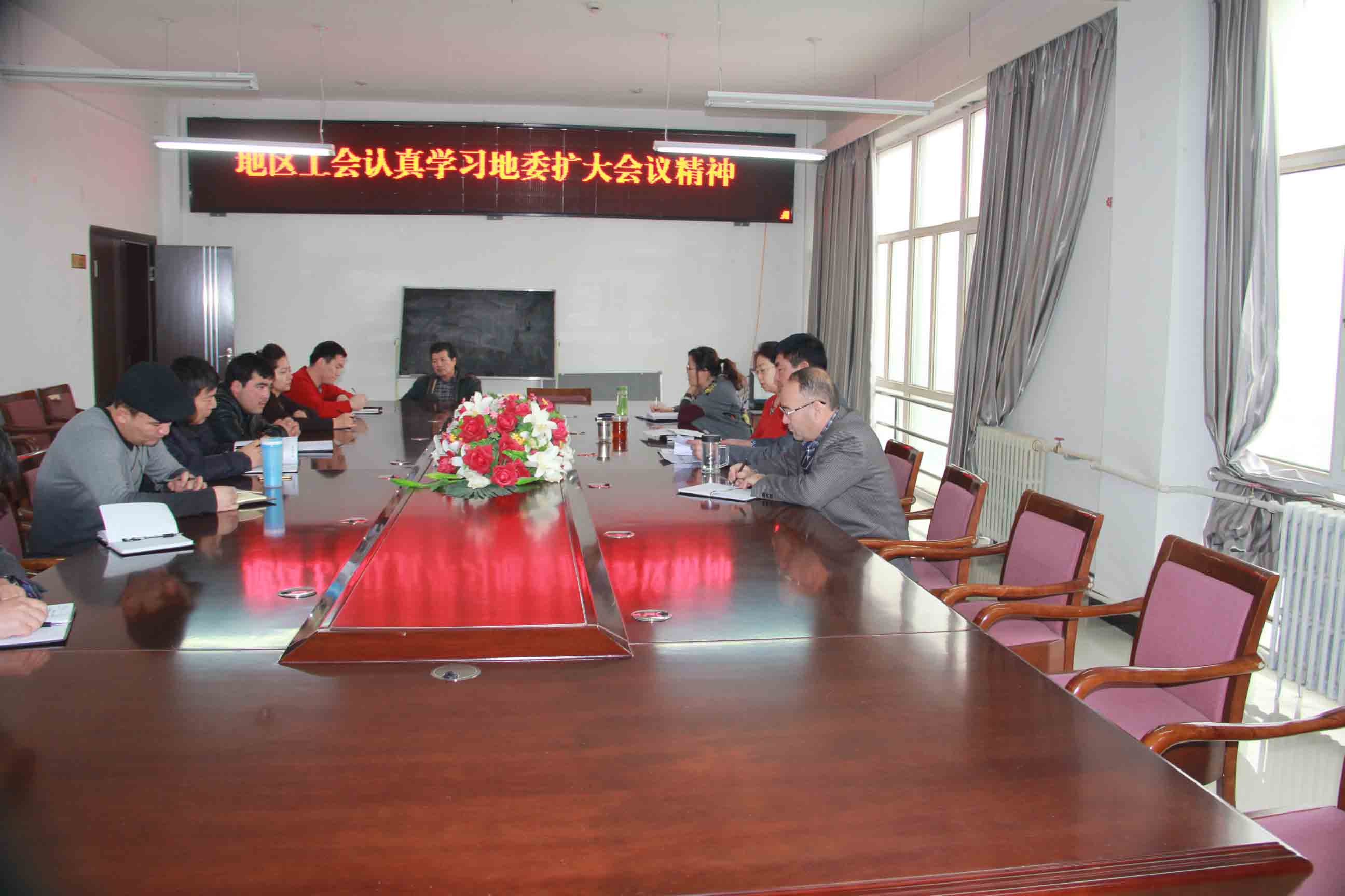 1月4日,地区工会组织单位全体干部职工认真学习地委扩大会议精神,通过领导带头讲、集中讨论等方式,认真领会地委扩大会议精神,结合地区工会实际工作认真学习讨论。要求各级工会要围绕地区“十三五”规划的战略目标和2016年工作任务,充分发挥工会联系职工群众的桥梁纽带作用,坚持围绕中心服务大局,在深入推进“去极端化”、各民族交往交流交融、支持反恐怖斗争、参与创新社会治理和维护职工权益上展现新作为。要求各县市总工会结合春节送温暖活动向基层一线职工,通过面对面宣讲、召开座谈会、入户走访等形式,走进企业、走近职工,广泛深入,大张旗鼓宣传地为扩大会议精神,宣传“两个一百年”奋斗目标,宣传“十三五”规划的指导思想、主要目标、基本理念和“一个中心”、“双引擎驱动”、“五大突破”、“七大产业”、“九大工程”等重大举措,通过富有成效的宣传,让职工切实感受到党和政府事业发展的宏伟蓝图,激发职工为实现“十三五”目标任务干事创业的热情,引领职工加强技术创新、提高业务本领,凝聚广大职工为全面建成小康社会建功立业。